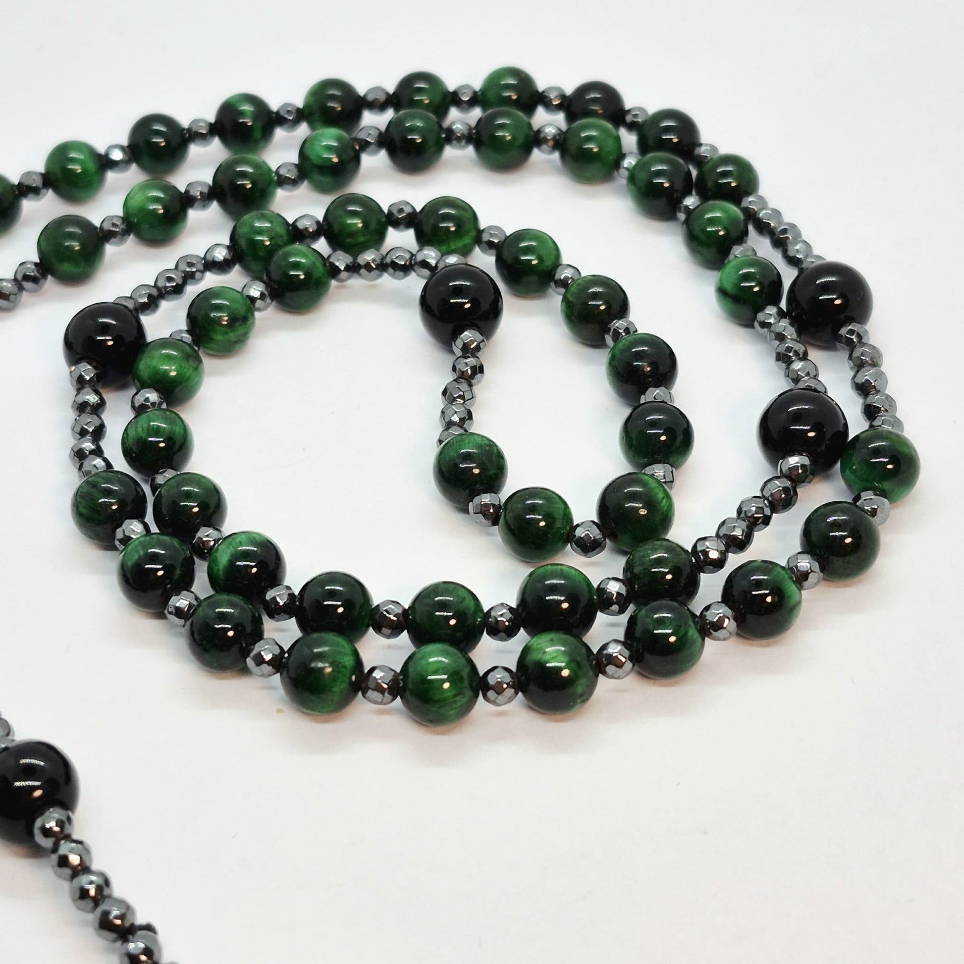 Elevate your spiritual practice with this striking Green Tiger Eye Rosary, where natural stone meets everyday style. Each bead showcases the mesmerizing bands of blue tiger eye, paired with grounding hematite accents for a look that's both meaningful and undeniably cool. Perfect for meditation, prayer, or simply carrying a touch of positive energy throughout your day. This isn't your grandmother's rosary—it's a modern statement piece that celebrates your unique spiritual journey with flair and intention.
