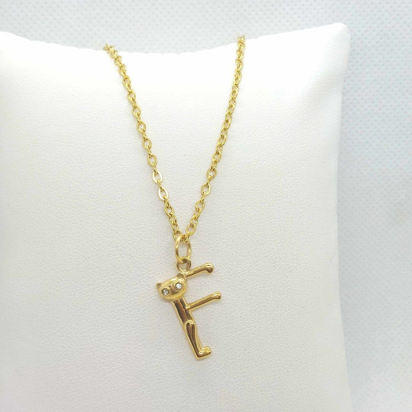 Initial F with Cute Cat Pendant with Stainless Steel Chain Necklace