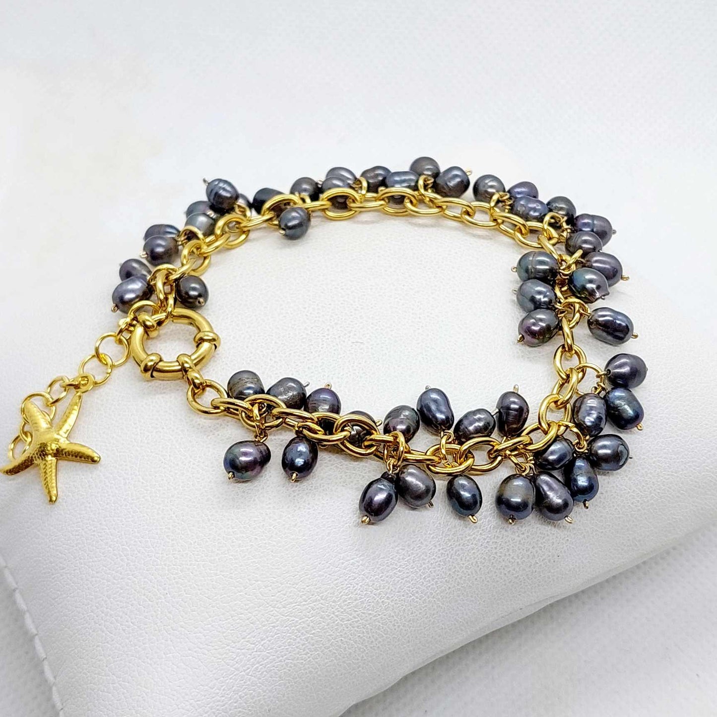 Natural Freshwater Dark Grey Pearl Bracelet in Gold Plated Stainless Steel