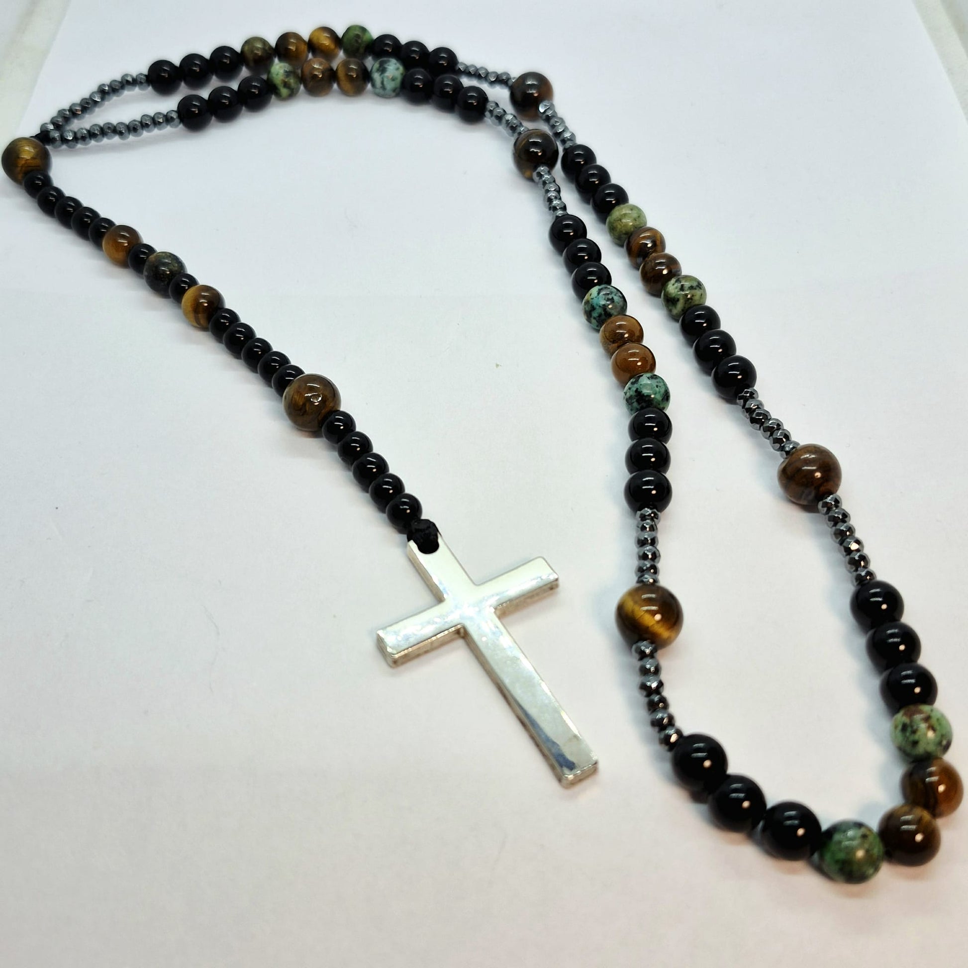 Natural Indian Agate and Obsidian Rosary with Hematite and Titanium